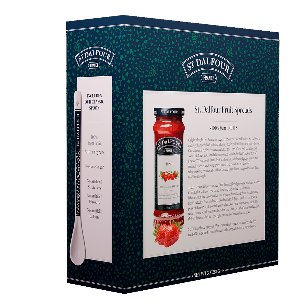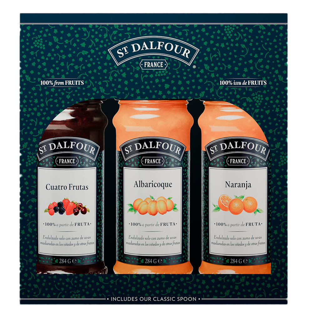 Eleva tu forma de regalar con nuestro Set de Regalo Triple de mermelada St Dalfour, cuidadosamente presentado con dos de nuestras mermeladas más apreciadas y una elegante cuchara. Cada untable está elaborado en Francia con ingredientes 100 % naturales y sin azúcar añadida, garantizando que disfrutes de los sabores puros y ricos de la fruta real en cada bocado.